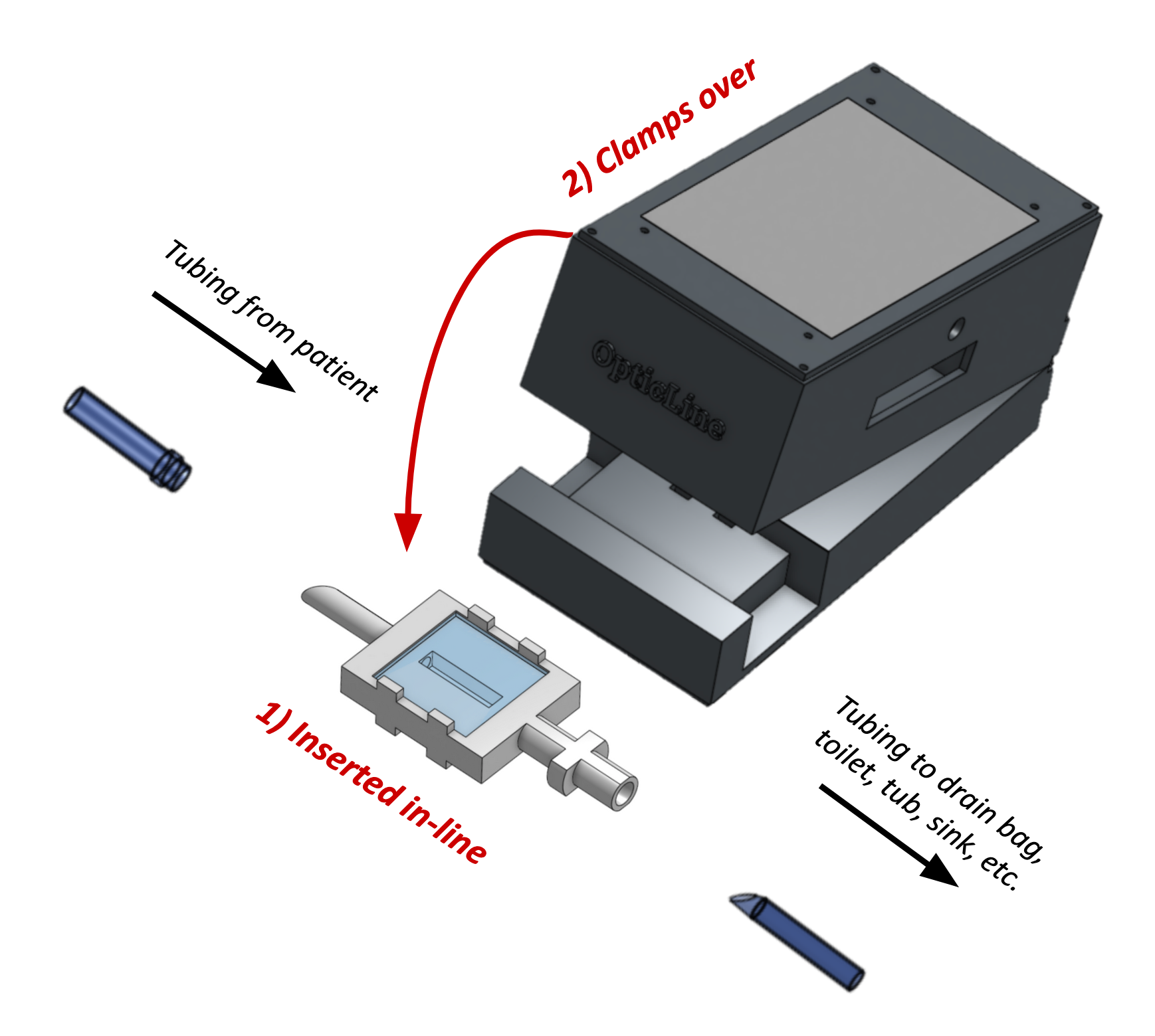 OpticLine consists of two components: a consumable viewing chamber, attached directly in-line to the PD drainage line, and the reusable clamp, which is placed over the chamber. The chamber is inserted via replicated male and female connectors to the drainage line and the drainage bag, respectively, and is replaced frequently. The OpticLine clamp houses the electronics, fastens snugly and securely over the chamber, and does not touch the effluent fluid. It is compact and powered by a standard household outlet. The clamp contains a touch screen user interface. We believe the OpticLine clamp can become even more compact once optimized for manufacturing; both items have been 3D printed for R&D but are intended to be mass-produced.